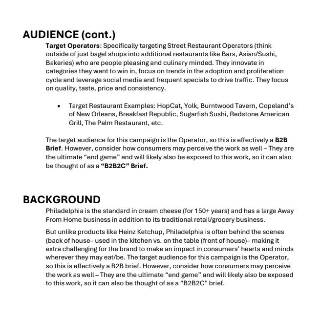 The brief makes it abundantly clear that Philadelphia is perceived hand-in-hand with bagels and the client wants a spotlight on other use cases.